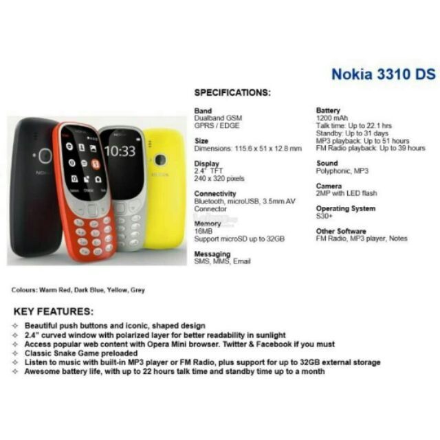 nokia 3310 features dual micro sim slots and support for up to 32gb microsd cards