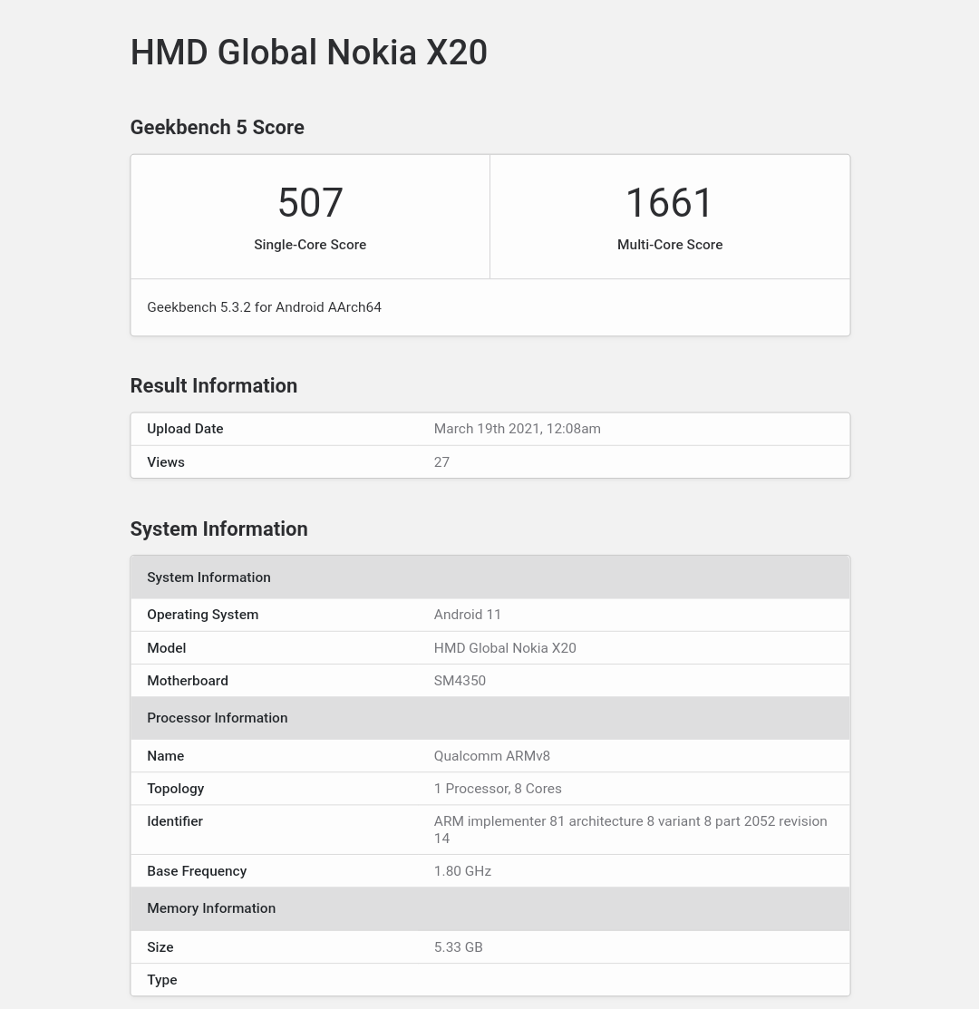 characteristics of nokia x20 from the benchmark aroged