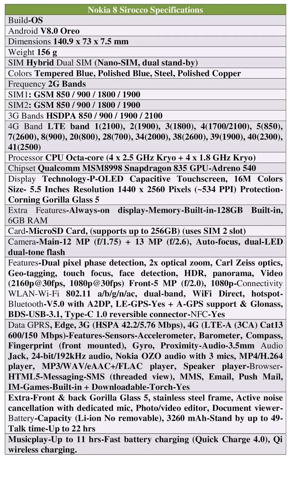 nokia 8 full phone specifications
